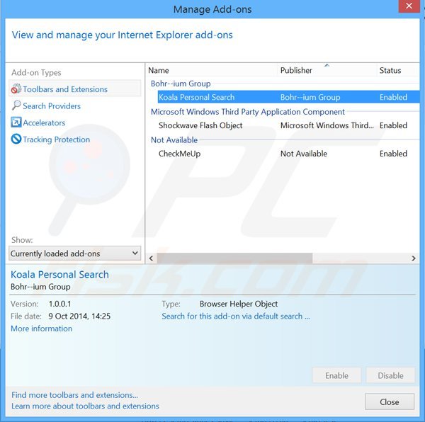 (no canto superior direito do Internet Explorer), seleccione "Gerir Add-ons". Procure por "Koala Personal Search", selecione esta entrada e clique em "Remover".