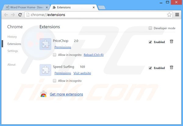 (no canto superior direito do Google Chrome), selecione "Ferramentas" e clique em "Extensões". Localize: "WordProser", selecione esta entrada e clique no ícone da reciclagem.