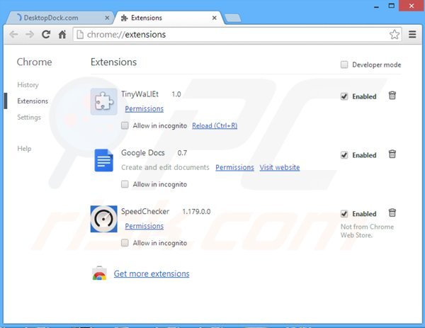 (no canto direito superior do Google Chrome), selecione "Ferramentas" e clique em "Extensões". Localize: "DesktopDock", selecione esta entrada e clique no ícone da reciclagem. Note que os anúncios DesktopDock podem ser causados por outro adware. Na janela das "extensões" do Google Chrome, remova todas as extensões de navegador suspeitas.