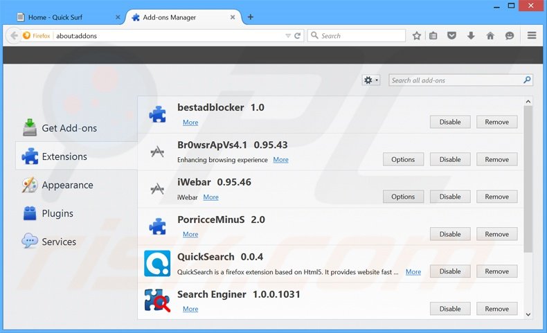 No momento da pesquisa, Quick Surf não instalava qualquer plug-in no navegador do Internet Explorer, Google Chrome, ou Mozilla Firefox; contudo, era agregado a outro adware. Por isso, é recomendável remover todos os add-ons potencialmente indesejados de navegador dos seus navegadores de Internet.
