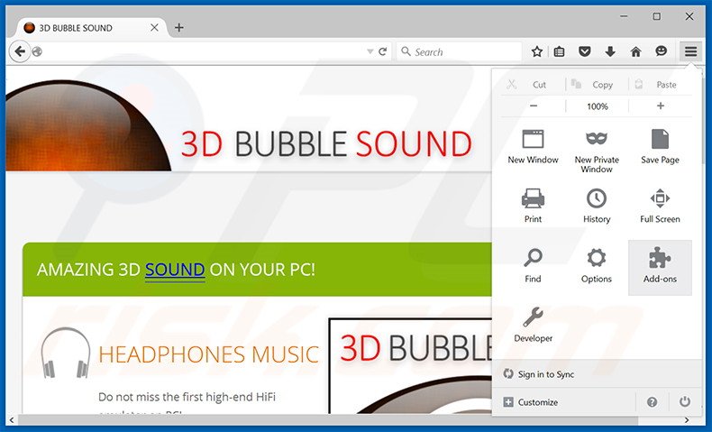 Os utilizadores de computador que estão a ter problemas com a remoção dos anúncios 3d bubble sound, podem repor as suas definições do Mozilla Firefox. Abra o Mozilla Firefox, no canto superior direito da janela principal clique no menu Firefox