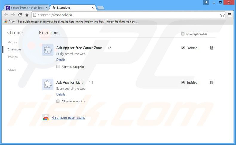(no canto direito superior do Google Chrome), selecione "Ferramentas" e clique em "Extensões". Localize todos os add-ons suspeitos, recentemente instalados, selecione essas entradas e clique no ícone da reciclagem.