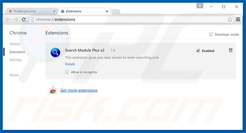 (no canto direito superior do Google Chrome), selecione "Ferramentas" e clique em "Extensões". Encontre todos os add-ons de navegador suspeitos, recentemente instalados, selecione estas entradas e clique no ícone da reciclagem.