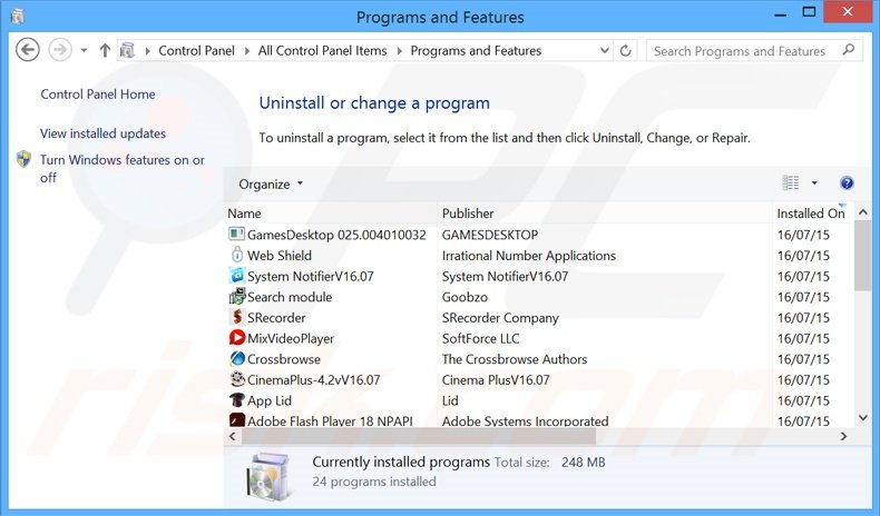 Na janela de desinstalação de programas: procure por aplicações potencialmente indesejadas recentemente instaladas (por exemplo "Your Tv Link"), seleccione estas entradas e clique "Desinstalar" ou "Remover".