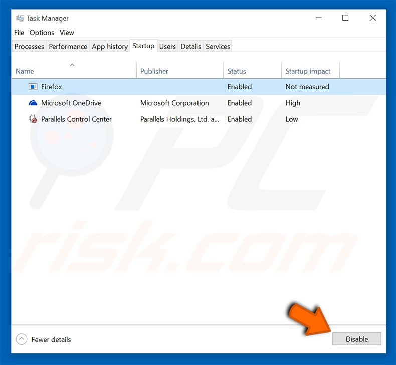 2. Seleccione o separador "Startup" e desactive a entrada de início "Firefox":