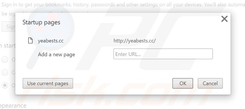 (no canto direito superior do Google Chrome), selecione "Configurações". Na seção "Arranque" clique em "definir páginas", passe o rato sobre hxxp://www.yeabests.cc e clique no símbolo x. Agora, pode adicionar o seu website preferido como a sua página inicial.