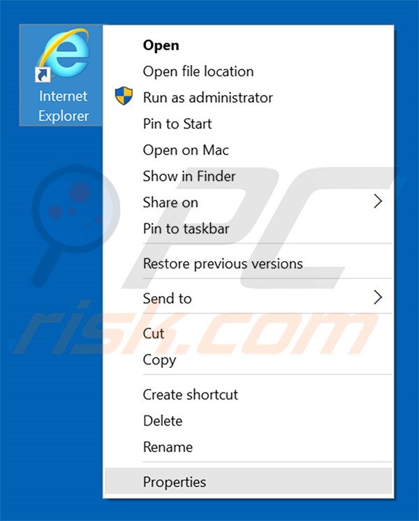 Este sequestrador de navegador modifica o campo "Alvo" do atalho do Internet Explorer. Para reparar isto, localize o atalho do Google Chrome no seu Ambiente de Trabalho e clique com o botão direito nele. No menu aberto, escolha "Propriedades". Na janela aberta, localize o campo Alvo e elimine o texto (hxxp://www.yeabests.cc/...), que está escrito após "C:\Program Files\InternetExplorer\iexplore.exe".