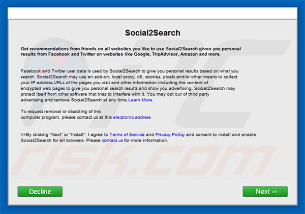 Social2Search é apresentada como uma aplicação legítima que supostamente melhora a experiência de pesquisa na web dos utilizadores ao mostrar o conteúdo partilhado pelos amigos dos utilizadores - "Quando pesquisa, Social2Search mostra-lhe o que os seus amigos partilharem.". Muitos pensam que esta funcionalidade é apropriada e muito útil. Contudo, a verdade é que Social2Search é atualmente categorizado como um programa potencialmente indesejado, bem como um adware. Após a infiltração silenciosa no sistema sem o consentimento dos utilizadores, Social2Search começa a exibir anúncios online intrusivos, bem como a monitorizar a actividade de navegação na Internet dos utilizadores.