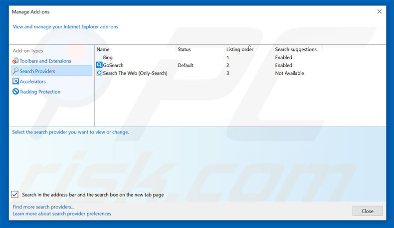 (no canto direito superior do Internet Explorer), seleccione "Gerir Add-ons". Na janela aberta, selecione "Pesquisar Fornecedores", defina "Google", "Bing", ou qualquer o outro motor de busca Search Engine preferido como padrão e depois remova "search".