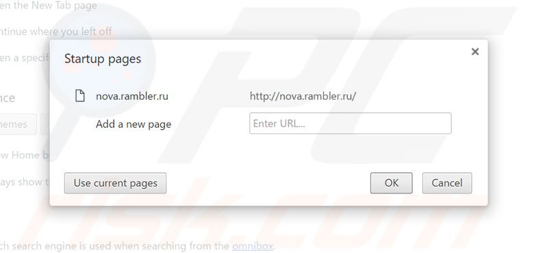 (no canto direito superior do Google Chrome), selecione "Configurações". Na seção "Arranque" clique em "definir páginas", passe o rato sobre hxxp://nova.rambler.ru e clique no símbolo x. Agora, pode adicionar o seu website preferido como a sua página inicial.