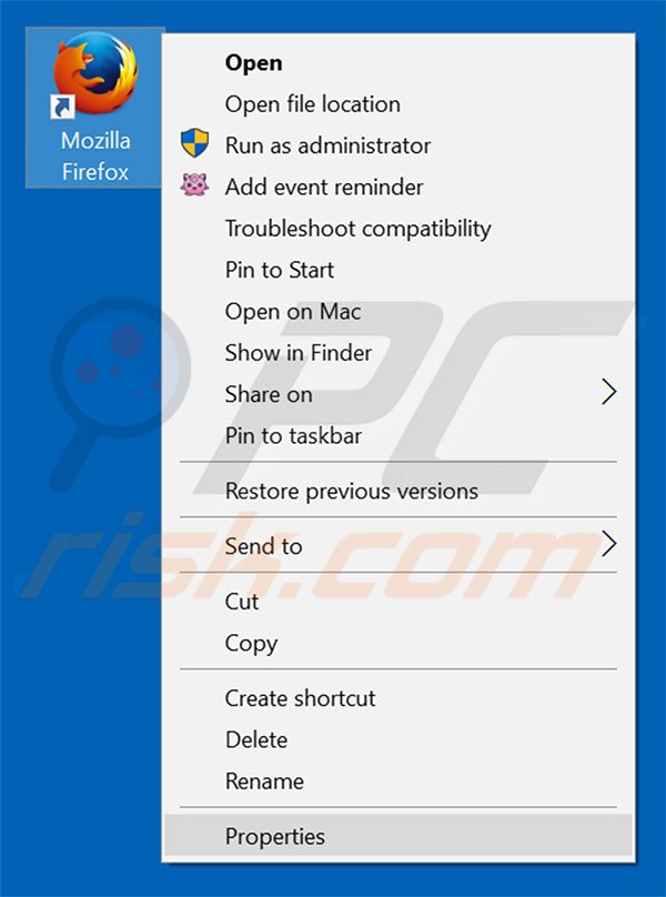 Este sequestrador de navegador modifica o campo "Alvo" do atalho do Mozilla Firefox. Para reparar isto, localize o atalho do Google Chrome no seu Ambiente de Trabalho e clique com o botão direito nele. No menu aberto, escolha "Propriedades".