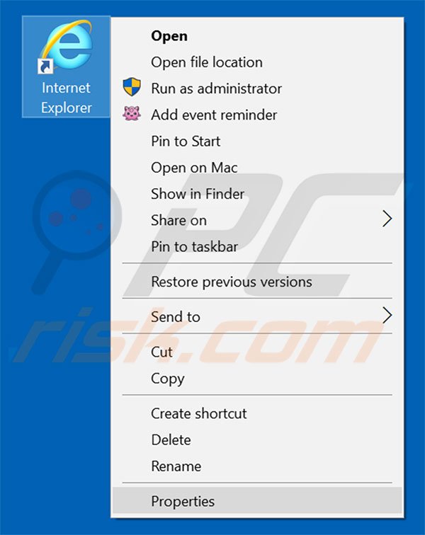Este sequestrador de navegador modifica o campo "Alvo" do atalho do Internet Explorer. Para reparar isto, localize o atalho do Google Chrome no seu Ambiente de Trabalho e clique com o botão direito nele. No menu aberto, escolha "Propriedades".