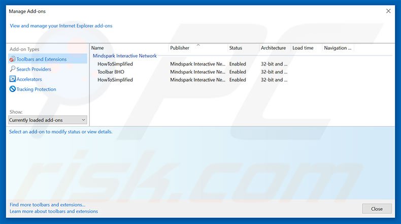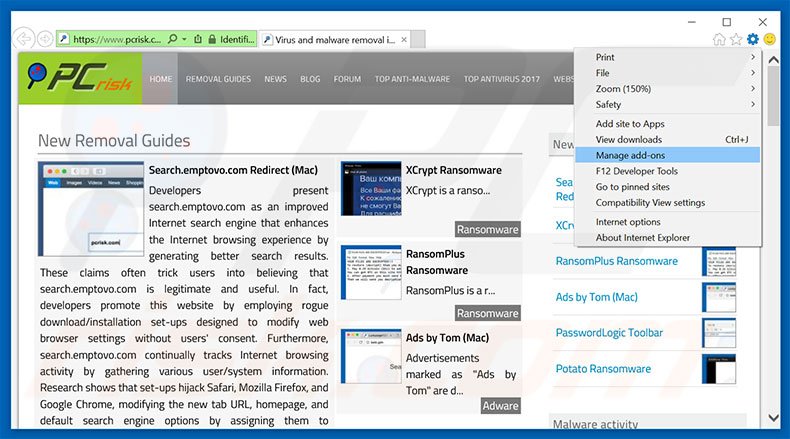 (no canto direito superior do Internet Explorer), seleccione "Gerir Add-ons". Procure todas as extensões suspeitas recentemente instaladas no navegador, selecione estas entradas e clique "Remover".