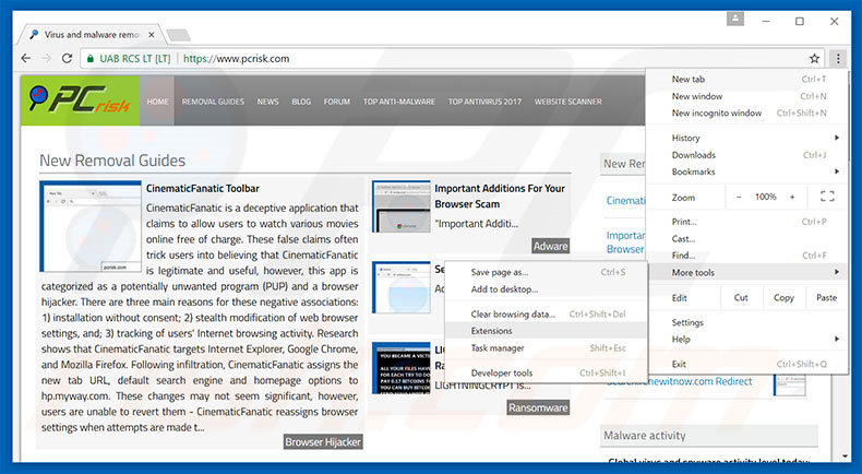 (no canto direito superior do Google Chrome), selecione "Ferramentas" e clique em "Extensões". Localize: todos os add-ons de navegador suspeitos, recentemente instalados, selecione estas entradas e clique no ícone da reciclagem.