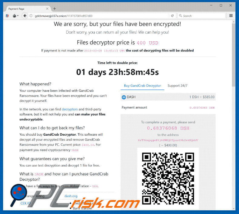 O novo ficheiro de texto contém uma mensagem informando as vítimas da encriptação e afirmando que os ficheiros só podem ser restaurados usando uma chave privada gerada individualmente para cada vítima. Infelizmente, esta informação é exata. É atualmente desconhecido se GANDCRAB 2 usa encriptação simétrica ou assimétrica, no entanto, em qualquer caso, a desencriptação requer uma chave exclusiva. Adicionalmente, os desenvolvedores ransomware ocultam essas chaves em servidores remotos e fazem pedidos de resgate pela sua libertação. A mensagem no ficheiro de texto encoraja as vítimas a visitar o site do GANDCRAB 2 armazenado na rede Tor. Depois de abrir este site, os utilizadores são solicitados com uma mensagem informando que a chave (juntamente com uma ferramenta de desencriptação) está disponível a um custo (valor equivalente = $400 em criptomoedas Dash). Também afirma que, após 48 horas, o custo vai duplicar. As vítimas são permitidas para desencriptar um ficheiro selecionado gratuitamente como 'garantia' a desencriptação é possível. Apesar destas ameaças e exigências, os criminosos virtuais não são confiáveis. A pesquisa demonstra que os desenvolvedores de vírus de tipo ransomwaremuitas vezes ignoram as vítimas, assim que os pagamentos são submetidos. Portanto, pagar resgates normalmente não dá em resultados positivos e vítimas são enganadas. Portanto, recomendamos que ignore todos os pedidos de contacto dessas pessoas ou pague resgates. Infelizmente, não existem actualmente ferramentas capazes de restaurar ficheiros encriptados por GANDCRAB 2 (não vai ajudar a ferramenta Bitdefender desenvolvida para a versão original do GANDCRAB). Portanto, a única solução é restaurar tudo a partir de uma cópia de segurança.