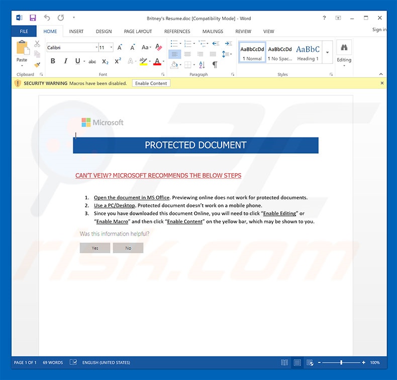 Como mencionado acima, as campanhas de spam por email promovem anexos fraudulentos (documentos do MS Office). Depois de abertos, esses ficheiros incentivam os utilizadores a ativar os comandos de macro, caso contrário, o conteúdo não será exibido corretamente. De fato, a ativação de macros permite que os anexos executem comandos que descarreguem e instalem furtivamente o AZORult. Esse método tem uma grande falha - os anexos não podem descarregar/instalar malwares se forem abertos usando um software diferente das ferramentas do MS Office. Por exemplo, se os ficheiros .doc forem abertos usando aplicações diferentes do MS Word, o malware não será descarregue. Além disso, o AZORult tem como alvo apenas o MS Windows e os utilizadores de outras plataformas são seguros.