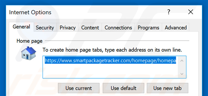 (no canto superior direito do Internet Explorer), selecione "Opções da Internet", na janela aberta, remova o hxxp://smartpackagetracker.com e insira o seu domínio preferido, que irá abrir sempre que iniciar o Internet Explorer. Também pode inserir about: blank para abrir uma página em branco ao iniciar o Internet Explorer.