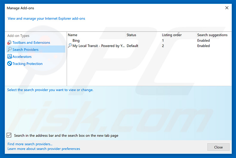(no canto superior direito do Internet Explorer), selecione "Gerir Complementos". Na janela aberta, selecione "Fornecedores de pesquisa", defina o "Google", "Bing" ou qualquer outro motor de pesquisa preferido como o seu padrão, em seguida, remova a "smartpackagetracker".