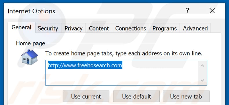 (no canto superior direito do Internet Explorer), selecione "Opções da Internet", na janela aberta, remova o hxxp://freehdsearch.com e insira o seu domínio preferido, que irá abrir sempre que iniciar o Internet Explorer. Também pode inserir about: blank para abrir uma página em branco ao iniciar o Internet Explorer.