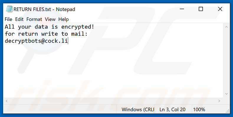 Todos os seus ficheiros foram encriptados! Se quiser restaurá-los, escreva-nos para o e-mail decryptbots@cock.li