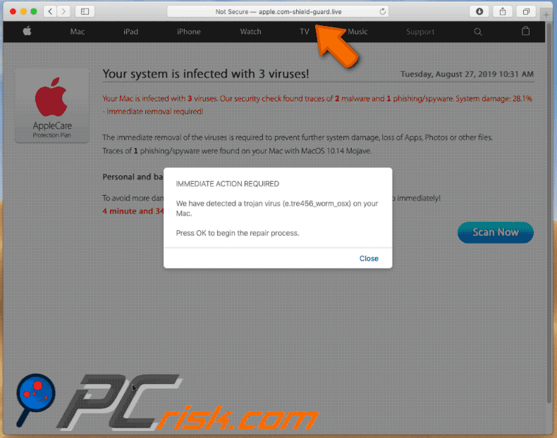 Vírus MacTambém conhecido como: pop-up apple.com-shield-guard.live