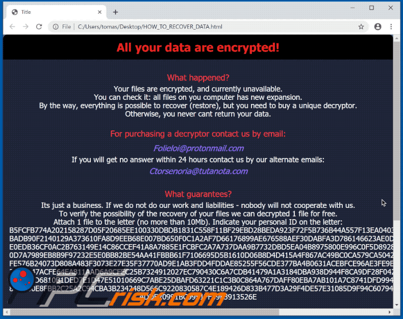 Isso, contudo, é raro. Na maioria dos casos, as infecções de ransomware exibem mensagens mais diretas, simplesmente afirmando que os dados foram encriptados e que as vítimas devem pagar algum tipo de resgate. Note que as infecções do tipo ransomware normalmente geram mensagens com nomes de ficheiro diferentes (por exemplo, "_readme.txt", "READ-ME.txt", "DECRYPTION_INSTRUCTIONS.txt", "DECRYPT_FILES.html", etc.). Portanto, usar o nome de uma mensagem de resgate pode parecer uma boa forma de identificar a infecção. O problema é que a maioria destes nomes são genéricos e algumas infecções usam os mesmos nomes, embora as mensagens exibidos sejam diferentes e as infecções em si não estejam relacionadas. Portanto, usar o nome do ficheiro da mensagem sozinho pode ser ineficaz e até mesmo conduzir à a perda de dados permanente (por exemplo, ao tentar desencriptar os dados utilizando ferramentas concebidas para diferentes infecções de resgate, é provável que os utilizadores acabem por danificar permanentemente os ficheiros e a desencriptação deixará de ser possível mesmo com a ferramenta correcta).