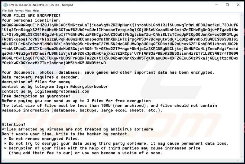Isso, contudo, é raro. Na maioria dos casos, as infecções de ransomware exibem mensagens mais diretas, simplesmente afirmando que os dados foram encriptados e que as vítimas devem pagar algum tipo de resgate. Note que as infecções do tipo ransomware normalmente geram mensagens com nomes de ficheiro diferentes (por exemplo, "_readme.txt", "READ-ME.txt", "DECRYPTION_INSTRUCTIONS.txt", "DECRYPT_FILES.html", etc.). Portanto, usar o nome de uma mensagem de resgate pode parecer uma boa forma de identificar a infecção. O problema é que a maioria destes nomes são genéricos e algumas infecções usam os mesmos nomes, embora as mensagens exibidos sejam diferentes e as infecções em si não estejam relacionadas. Portanto, usar o nome do ficheiro da mensagem sozinho pode ser ineficaz e até mesmo conduzir à a perda de dados permanente (por exemplo, ao tentar desencriptar os dados utilizando ferramentas concebidas para diferentes infecções de resgate, é provável que os utilizadores acabem por danificar permanentemente os ficheiros e a desencriptação deixará de ser possível mesmo com a ferramenta correcta).