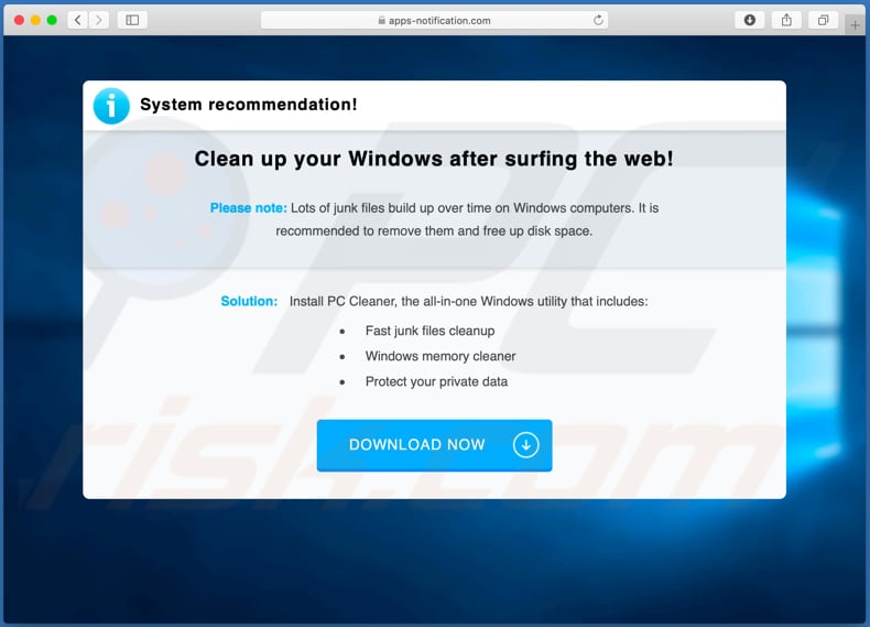 Screenshot de apps-notification[.]com destinada a utilizadores do Windows: